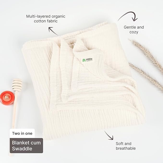 - Wrap your baby in comfort with littlu’s 2-layer premium muslin organic cotton swaddle, sized at 100×100 cm. Ultra-soft, breathable, and eco-friendly, it ensures a snug fit to calm your little one. Its versatile design allows it to be used as a swaddle, blanket, nursing cover, or stroller blanket, growing with your baby.