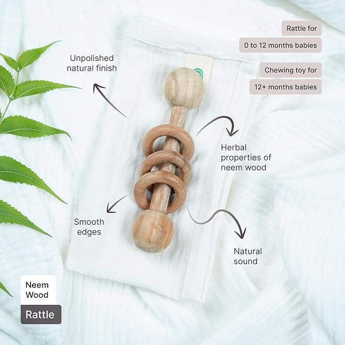 - Capture your baby’s attention with the neem wood dumbbell rattle, featuring a unique shape and gentle sound. It promotes fine motor skills and hand-eye coordination while being safe and durable. Made from high-quality neem wood, this rattle also serves as a teether for babies above 8 months. It’s a fun & engaging toy that supports your baby’s development.