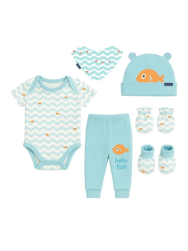 - Combo Set with Coordinated Must-Haves Includes 6 essential items in one thoughtfully curated box: 1 Onesie 1 Bottom 1 Cap 1 Pair of Booties 1 Pair of Mittens 1 Bandana Bib