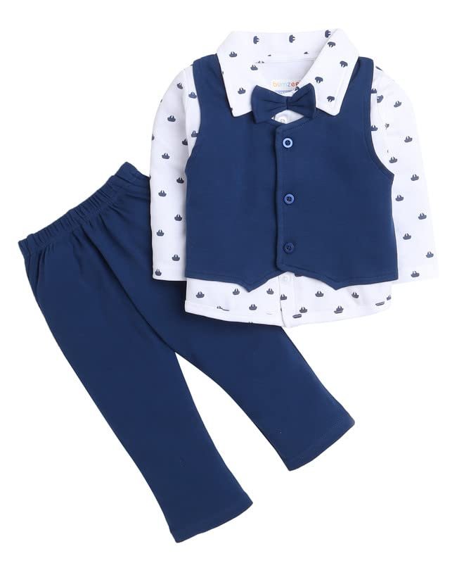 BUMZEE Boy’s Cotton Printed Full Sleeves Shirt Waistcoat & Pant Set With Applique Bow (Peb4118)