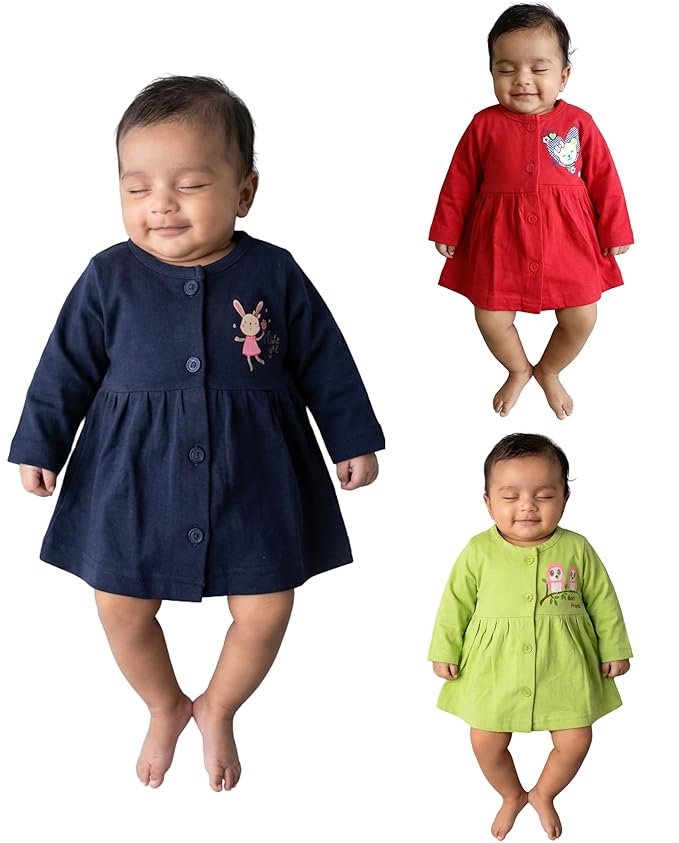 Funny Bear Full Sleeve Regular Wear Round Neck A Line Knee Length Cotton Frock for Baby Girl | Front Open Baby Frocks 0-3 Months Dress Combo Pack of 3