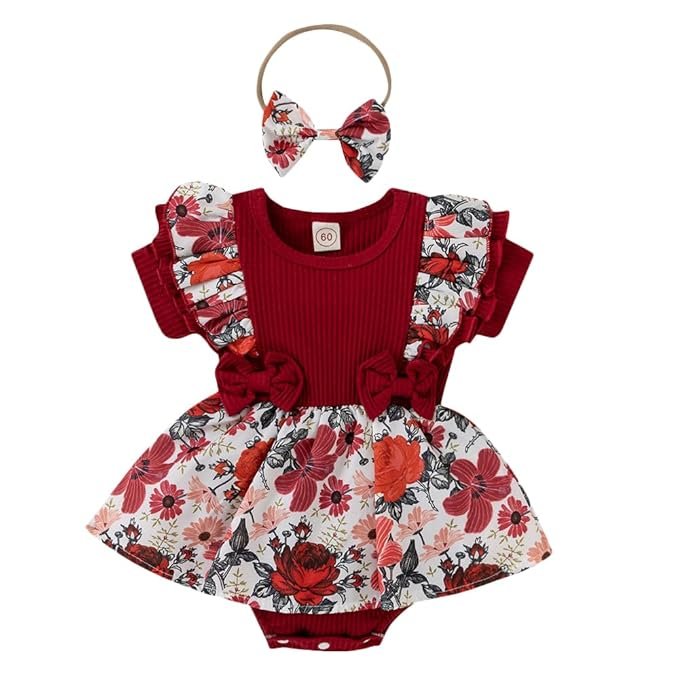 Hopscotch Girls Cotton and Polyester Floral Print Ruffled Bodysuit With Headband in Red Color