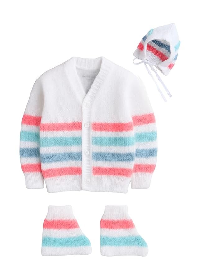 Little Angels 3-Piece Baby Woollen Sweater Set | Full Sleeves V-Neck Knitted Sweater, Cap & Socks | Winter Outfit for Newborns (0-12 Months)