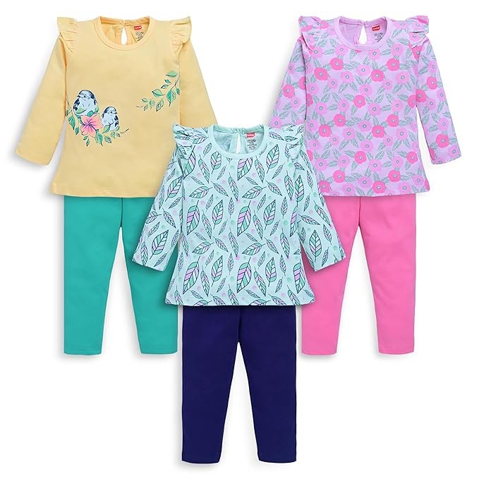 LuvLap Baby Girls 100% Cotton Full Sleeve Top & Pyjama Sets, Pack of 03