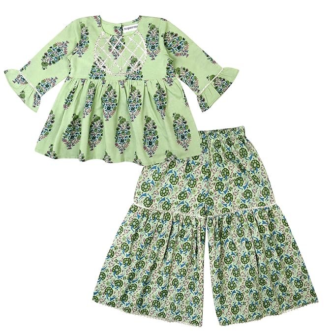 superminis Girls Cotton Floral Printed Gotta Work Full Sleeves Kurti and Matching Sharara Ethnic Wear Set