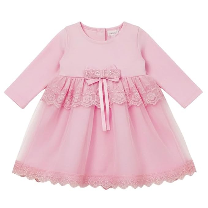 TBM Girls Cotton Frock Dress | Baby Pink Plain Outfit with Lace and Bow | Long Sleeve Baby Girl Dress