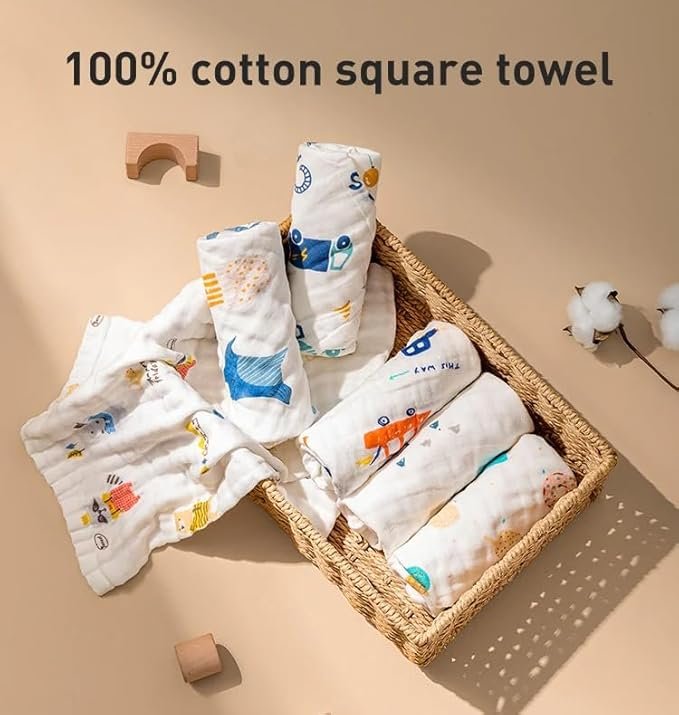 Package includes : 5 pcs Soft Muslin 6 Layer Cotton White Printed Hankies/Napkins with cute attractive prints.Size: L-24cm,B-24cm in 6 layers.