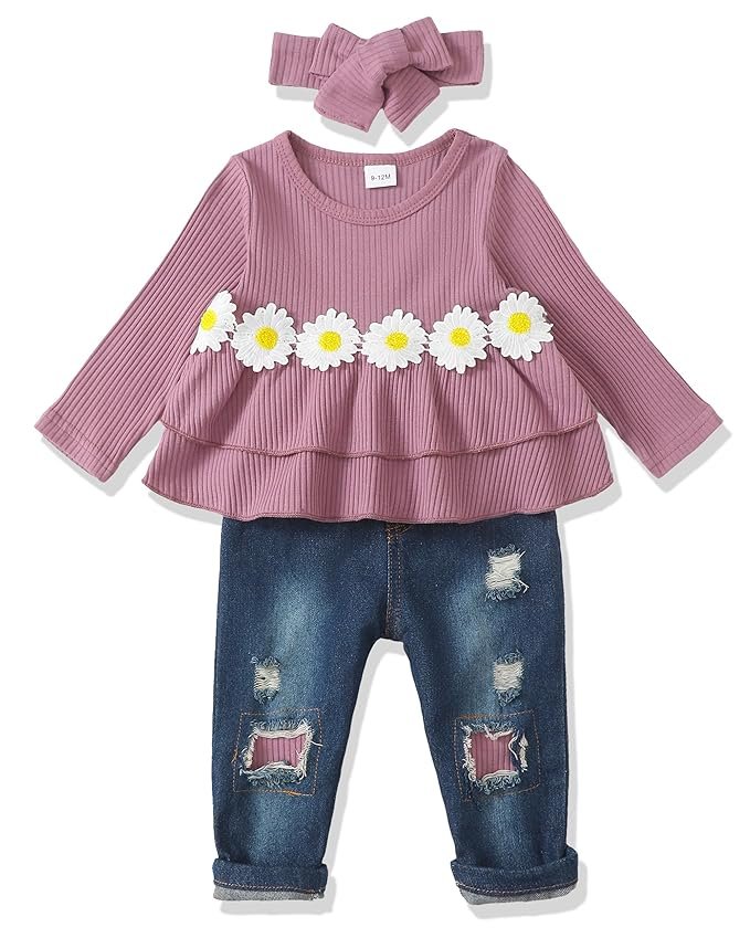 XUANHAO Infant Toddler Baby Girl Clothes Denim Jeans Outfits 2PCS Ruffle Floral Top + Ripped Denim Girls Pants Set 6M-4T